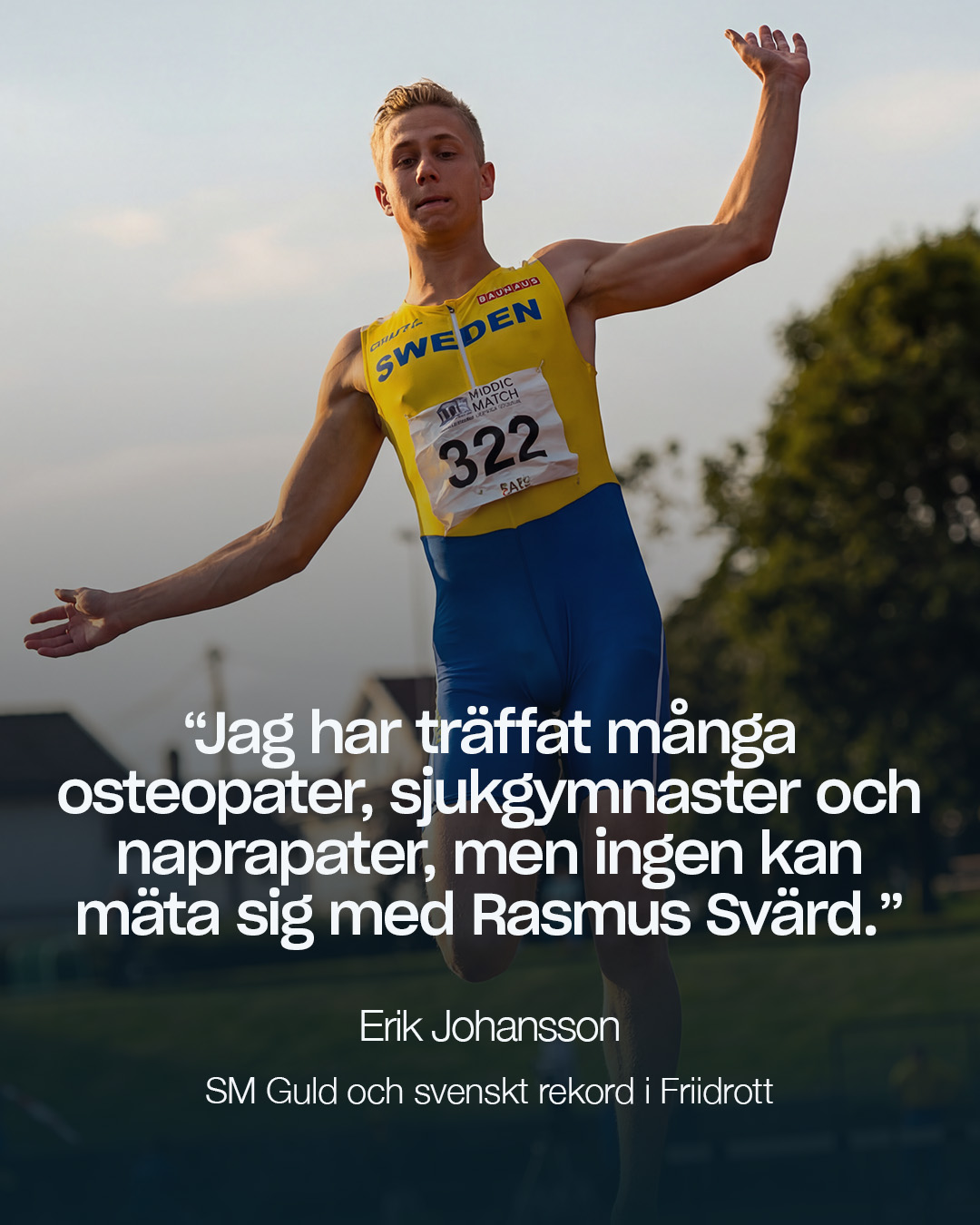 Jag har träffat en mängd osteopater, sjukgymnaster och naprapater men ingen kan mäta sig med Rasmus Svärd! Han har hjälpt mig att hitta en balans i kroppen och fått mig att prestera på topp. Genom behandling och träningsprogram har Rasmus fått mig att bli av med återkommande problem och skador.