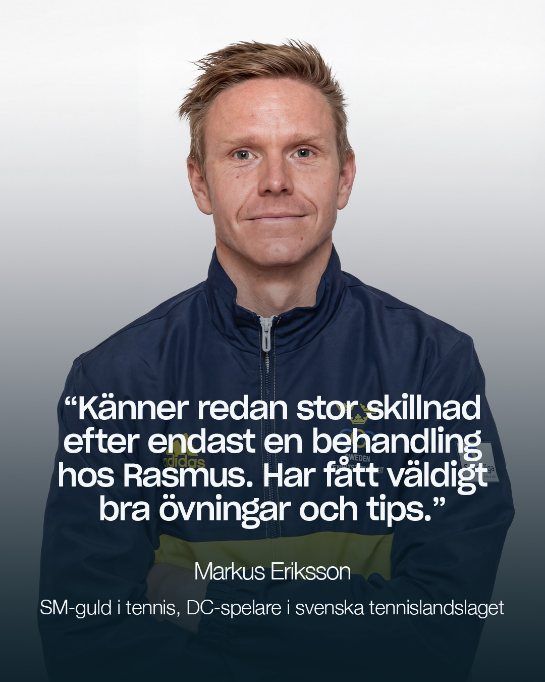 ”Tack Rasmus för att du lyckades hjälpa mig tillbaka till det bästa som finns, tennis! För ett år sedan rycktes tennisen bort från mitt liv. Tennis har varit en stor del av mig så länge jag minns. Min höftskada blev den största utmaningen jag har mött med smärtor över 1 års tid innan jag träffade Rasmus! Efter två besök hos honom har jag varit smärtfri. Jag fortsätter med dina övningar och följer dina råd. Min tacksamhet till dig går inte att beskriva med ord.”