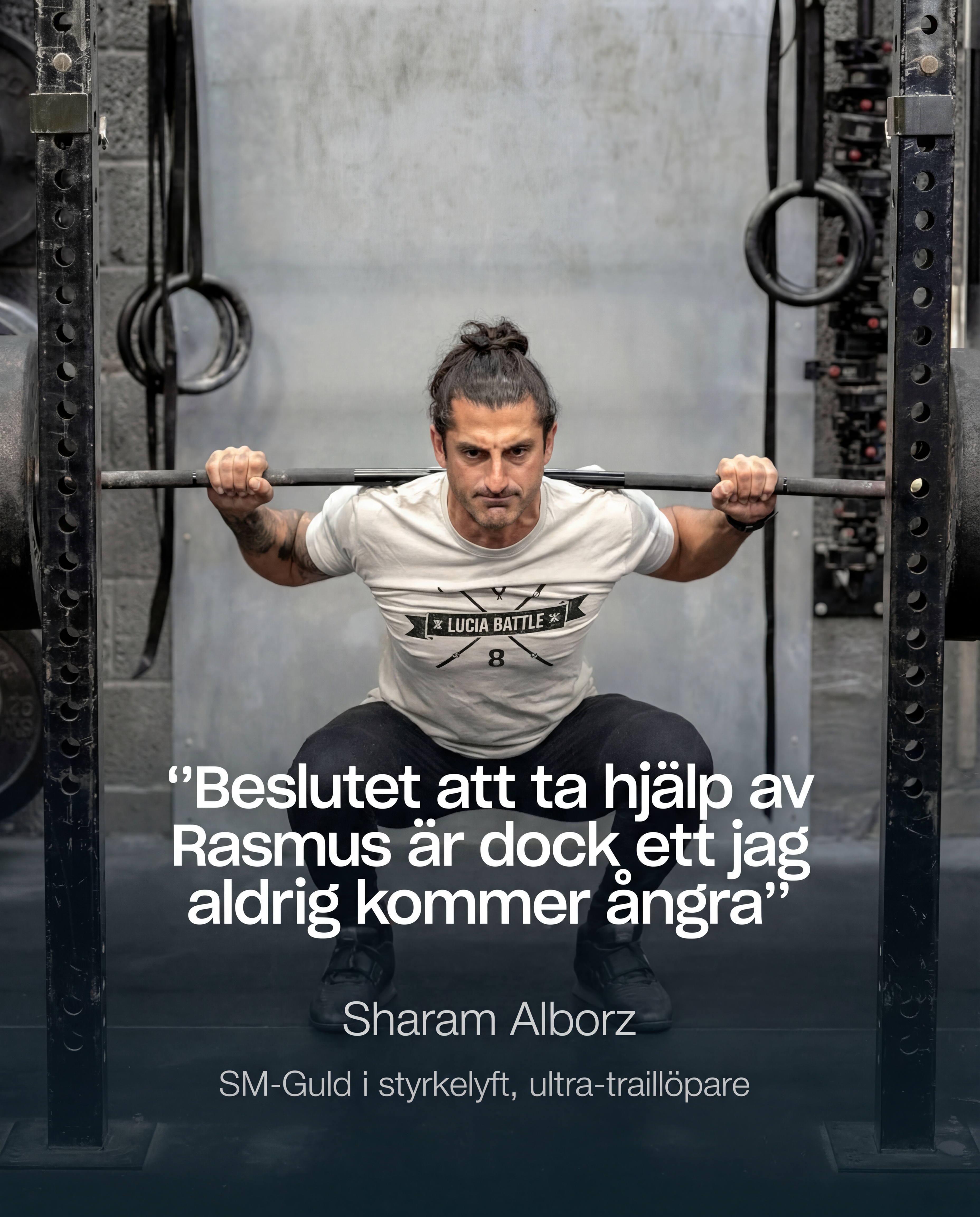 – Sharam Alborz, SM-Guld i styrkelyft, ultra-traillöpare och ägare av Vagnhallen CrossFit. Tidigare innehavare av svensk rekord i marklyft 275,5 kg med en kroppsvikt på 73,5